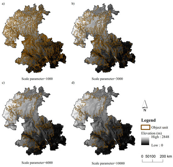 With different scale parameter settings, the multi-segmentation based on the elevation was performed and the stratifications at the corresponding scale parameter were generated. Figure 5 shows the examples of the stratification results at four specific scale parameters. When the scale parameter equals 10,000, the segmentation divided the study area into different stratifications with an obvious elevation gradient from the northwest to southeast. A smaller scale parameter resulted in a larger number of stratifications, which depicted more details in the local terrain variations.