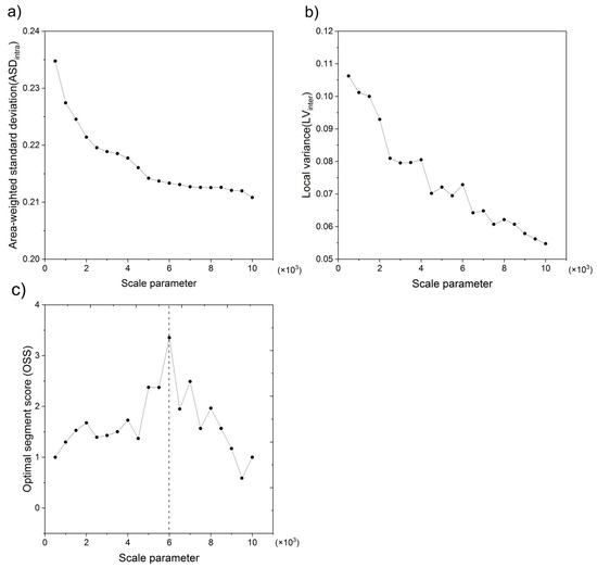 Based on the land-use characteristics within the stratifications at different scale parameters, the ASDintra, LVinter, and OSS were calculated (Figure 6). The results showed a similar decrease in ASDintra and LVinter, but a more fluctuating change for LVinter. With the increase in the scale parameter, the ASDintra showed an initial significant decrease followed by a slow decrease. There was a somewhat fluctuating decrease of LVinter as the scale parameter increased. This change indicated an increase in intra-segment homogeneity, but a decrease in inter-segment heterogeneity as the scale parameter increased. This result implied that the maximization of the intra-segment homogeneity and inter-segment heterogeneity could not be realized simultaneously.