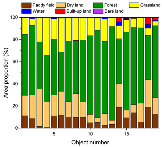 where Nj is the number of the land-use type (Nj = 7 in this study); j denotes the land-use type (such as paddy field, dry land, forest, grassland, water, built-up area, and bare land); mij is the j land-use proportion of i stratification; and indicates of all stratifications’ means. A higher LVinter indicated a higher inter-segment heterogeneity within all the segmented stratifications.