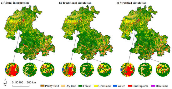 Comparison of land use in 2015 from (a) referenced visual interpretation; (b) traditional simulation; (c) stratified simulation.