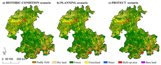 Based on the three scenario settings, the spatial land uses of the study area in 2030 were projected (Figure 9 and Table 7). Consistent with the change in the trend from 2000 to 2015, three scenarios presented the same change in trends, but with different magnitudes for each land-use type from 2015 to 2030. The forest, water, and built-up land increased, while inversely the paddy field, dry land, grassland, and bare land decreased. The historic-condition scenario presented a relatively low change rate of land use, while the planning and protect scenarios forecasted a sharp increase of built-up land and forest, respectively, but a sharp decrease of other land-use types.