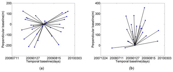 Temporal/perpendicular baseline plots. (a) TerraSAR-X Spotlight images for HKIA and (b) TerraSAR-X Stripmap images for HKSP.