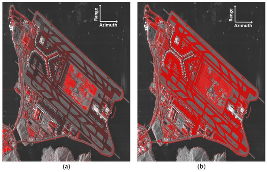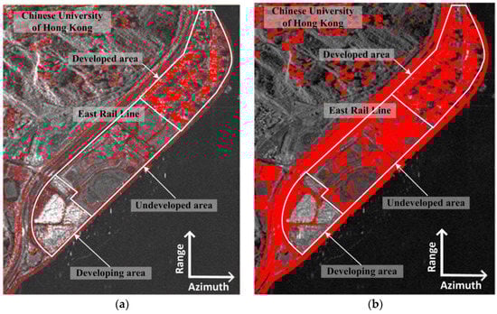 Figure 5 illustrates a comparison of MPs over the HKIA site identified by a PSI method (IPTA implementation) and the proposed DSI strategy. Overall, the DSI strategy retrieved approximately 8 times the number of MPs compared to using the PSI method, with the spatial density (total number) of MPs increasing from 46,000/km2 (574,637) with PSI to 360,000/km2 (4,495,561) with DSI. The PSI method provided very good coverage over most parts of the man-made structures such as roofs, buildings, rail tracks and the seawall of the airport. However, the proposed DSI strategy provides extra information over the area covered with sparse vegetation, asphalt ground, non-cultivated land with short vegetation or other development regions. The MPs on both the southern and northern runways were also increased greatly. This stems from the runway being very smooth, and the received radar reflected echo signal is weak, which cannot be effectively identified by the PSI method.