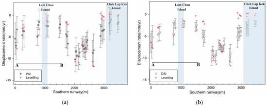 Comparison between the InSAR-retrieved deformation rates and benchmark levelling measurements (represented by white circles in Figure 6b) along the southern runway: (a) PSI method, and (b) DSI strategy. Grey areas approximately indicate the boundaries of the original islands of Chek Lap Kok and Lam Chau. The segment A–B of the black line shows the location of geological cross-section in Figure 2a.