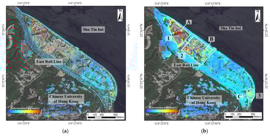 The same PSI and DSI processing procedures used at HKIA are also applied in this study area. The distribution of PSs and DSs at the HKSP site is shown in Figure 12. Obviously, the DSI reveals a great improvement in the density of MPs with respect to the PSI, and an incredible ability to identify MPs across various land covers in reclaimed areas, which are typically unfavourable for conventional InSAR approaches. While the PSI method only tends to exist in areas dominated by point-like scatterers such as building structures in developed areas, the seawall, and highways, the number of MPs identified with the DSI (90,374 DSs) increases by over 3.5 times compared with the PSI (33,483 PSs). The increased MPs are concentrated mainly in non-urban areas such as bare soil, sparse vegetated areas and asphalt pavement, particularly in the undeveloped area of HKSP (see Figure 12). Neither the PSI or DSI strategy are able to effectively extract the monitoring points in the developing area, because this area was undergoing large-scale construction activities during the monitoring period, which led to severe temporal decorrelation.