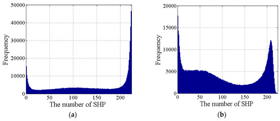 Histograms of the SHP number identified by (a) KS test and (b) FaSHPS. Horizontal axis is the number of SHPs based on a 15 * 15 window. Vertical axis is the pixel count at each corresponding SHP number.