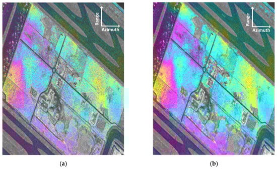 In our study, we consider the primary (T1) dominant scattering mechanism as the deformation signal [34]. The phase of the eigenvector corresponding to the largest eigenvalue () is substituted and used to estimate land deformation for the DS [35,41].