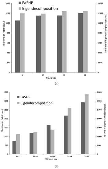 Computational time for FaSHPS and eigendecomposition using (a) different stack sizes and (b) estimated window sizes for 1000 * 1000 pixels.