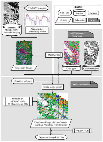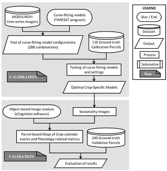 In this context, we propose an innovative procedure to assess and map four crop calendar events and seven crop phenology metrics by analyzing pixels of a MODIS-NDVI time-series in an object-based framework. Compared to previous works, the novelty of our method lies in three main points: (1) the development of an operational method to produce the maps in regions with diverse crop types (both woody and herbaceous crops); (2) the application of a restrictive criterion to mitigate the impact of mixed pixels using only “pure” pixels in the parcels where this is possible; and (3) codification and delivering (in table and vector formats) of the map outputs at the level of single parcels for further agro-environmental applications. In addition, the investigation also included the following specific objectives: (1) studying the performance of three curve-fitting models for estimating the crop calendar events of seven major crop types; (2) defining the optimal settings of each curve-fitting model according to the crop type; and (3) assessing similarities and differences between the studied crops in terms of the crop calendar and phenology data delivered by the maps and tables.