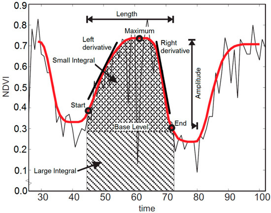 In addition to the crop calendar events, the parameters Base, Maximum, Amplitude, Left Derivative, and Right Derivative, and Large Integral, and Small Integral are indicators of crop dynamics, having been related to variations on crop phenology, vegetation vigor, and crop productivity [32,33,34]. According to Eklundh et al. [31], these seven phenology-related metrics were calculated as follows (Figure 4). (1) The Base is the average of the left and right minimum NDVI values of the fitted function. (2) The Maximum is the largest NDVI value of the fitted function during the season. (3) The Amplitude is the difference between the maximum and the base values. (4) The Left Derivative is the ratio of the difference between the left 20% and 80% levels of the fitted function and the corresponding time difference. (5) The Right Derivative is the absolute value of the ratio of the difference between the right 20% and 80% levels of the fitted function and the corresponding time difference. (6) The Large Integral is the area between the fitted function and the zero level. (7) Lastly, the Small Integral is the area between the fitted function and the base value.