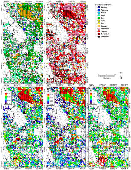 Per-parcel maps of two crop calendar events: (a) Start of the Season; and (b) End of the Season; and of three phenology-related metrics: (c) Left Derivative; (d) Right Derivative; and (e) Small Integral. Other maps of the Middle of the Season and Length of the Season events, and the Base, Maximum, Amplitude and Large Integral metrics were created, but are not shown here. The black/white areas are other land uses that were not included in this research (urban/road, meadow lands, water bodies, and other crops).