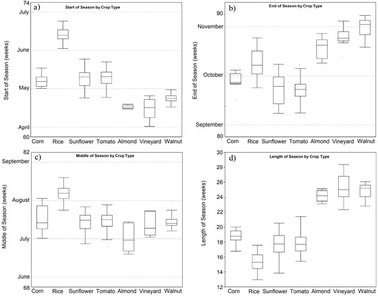 Detailed analysis of the maps (e.g., Figure 6) and tables (e.g., Table 3) derived from our procedure revealed significant differences in the phenology of some major crops growing in the entire study region. Regarding crop calendar events (Figure 7), permanent woody crops (i.e., almond, walnut, and vineyard) showed earlier dates of Start of Season (mid-April on average) and later dates of End of Season (from mid-October to early November on average) in comparison to annual herbaceous crops (i.e., corn, rice, sunflower, and tomato), in which the crop cycle started about early May and ended about late September in most cases (Figure 7a,b, respectively). However, the green-up date of the flooded rice fields was generally much later than the rest of the herbaceous crops, since these fields were covered by water in early crop growth stages, and this interfered with the estimations from the temporal MODIS-NDVI profiles for about 30–40 days until the rice canopy was closed, as also indicated by Dong et al. [21]. The interval between the beginning and end of the season (i.e., Length of Season) is critical in summer crops for scheduling irrigation, while the Middle of Season identifies the period in which the demand of the crops for water generally reaches maximum levels [39]. On the one hand, the mid-season of most of the crops in our study was about July on average, although many almond fields brought this date forward to the end of June, and many rice fields delayed it to early September (Figure 7c). On the other hand, the Length of Season values that were estimated for the herbaceous crops ranged between 15–16 weeks in the rice parcels and 18–19 weeks in the corn fields, and for the woody crops, these were about 24–26 weeks in the three studied crops (Figure 7d). This was consistent with the typical crop calendar patterns as described in the study region [40].