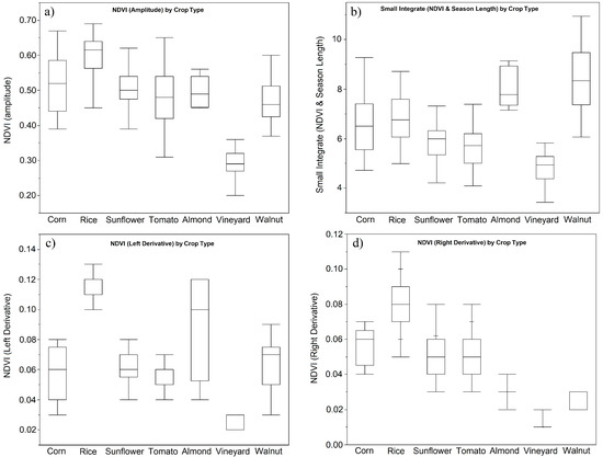 Averaged values of phenology-related metrics as affected by type of crop: (a) NDVI Amplitude; (b) NDVI Small Integral; (c) NDVI Left Derivative; and (d) NDVI Right Derivative. Other metrics such as NDVI Base, NDVI Maximum, and NDVI Large Integral are not shown.