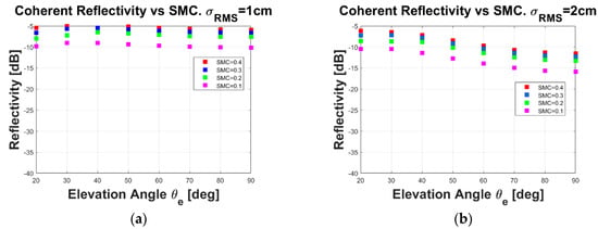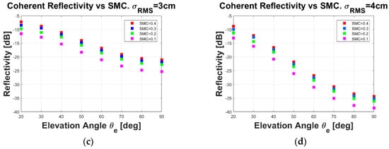 Theoretical prediction of coherent reflectivity as a function of the elevation angle for different levels of soil moisture content (SMC) and surface roughness: (a) = 1 cm, (b) = 2 cm, (c) = 3 cm, and (d) = 4 cm.