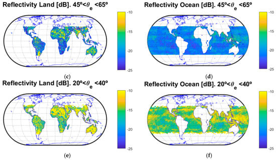One-month (from 20 September to 20 October 2017) averaged CyGNSS bistatic reflectivity values for elevation angles ≈ [70, 90]° [(a) land, (b) ocean], ≈ [45, 65]° [(c) land, (d) ocean] and ≈ [20, 40]° [(e) land, (f) ocean]. CyGNSS coherent integration time = 1 ms, incoherently averaged samples = 1000. Earth’s surface coverage is in the latitude range ≈ [−40,40]° because of the orbital inclination ≈ 35° of the CyGNSS satellites. Thus, only nearly equatorial areas are studied.