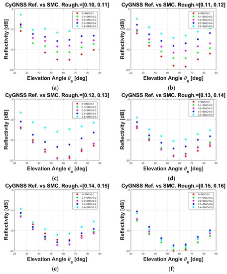 One-month (from 20 September to 20 October 2017) averaged CyGNSS bistatic reflectivity as a function of the elevation angle for different values of effective surface roughness parameter : (a) [0.10,0.11], (b) [0.11,0.12], (c) [0.12,0.13], (d) [0.13,0.14], (e) [0.14,0.15], and (f) [0.15,0.16]. For each plot (a–f), different levels of SMC were used in this analysis at steps of 0.1 m3/m3, from 0 m3/m3 to 0.5 m3/m3. The averaging was performed over the complete land-surface coverage enabled by CyGNSS.