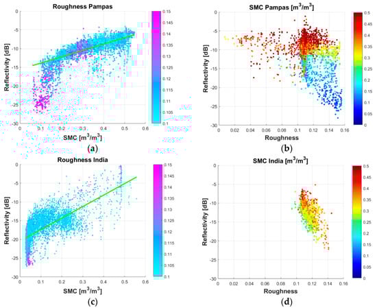 The target area over India was selected because this was a relatively dry region with some SMC peaks, so as to complement the information obtained from the wet Argentinian Pampas. increased due to a positive gradient on SMC. This effect was lower than over the Argentinian Pampas because of the reduced roughness range < 0.13 as compared to that over the Argentinian Pampas < 0.16. This result agrees with the conclusions derived from Figure 6b,d,f, where the effect of surface roughness was shown to be more significant for > 0.13.