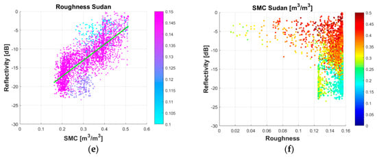 Scatter plots over specific target areas [(a,b) Argentinian Pampas, (c,d) India, and (e,f) Sudan] of (a,c,e) the CyGNSS reflectivity vs soil moisture content (SMC) as a function of surface roughness parameter and (b,d,f) the CyGNSS reflectivity vs. surface roughness parameter as a function of SMC. The selected elevation angles ranges corresponded to the maximum Pearson correlation coefficient between and SMC (Table 2). The robust fit regression lines are shown in green.