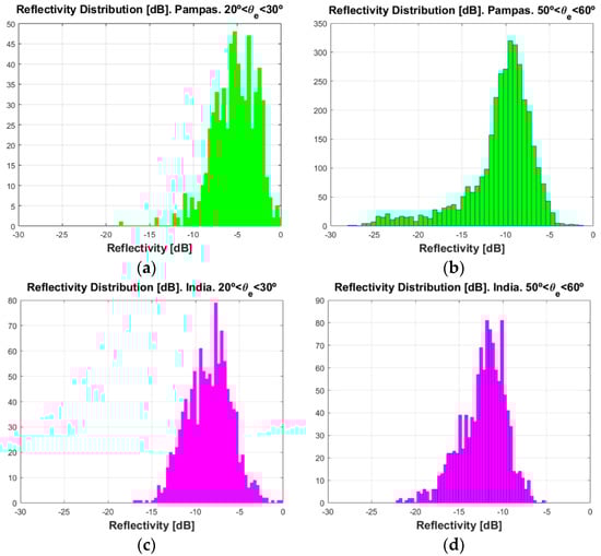 The histograms of over these target areas are displayed to complement the observations on the correlation coefficients (Figure 7). The corresponding statistics are also included in Table 4. Significant changes on the histograms were found from ≈ [20,30]° (Figure 7a,c,e) to ≈ [50,60]° (Figure 7b,d,f). The lowest mean and the highest standard deviation (SD) of the three target areas appeared over Sudan (Table 4). In this sense, it seems reasonable that the maximum correlation in Sudan was achieved over a significantly lower as compared to the Argentinian Pampas and India. A lower angular range was required to achieve a high enough signal coherence. A bimodal distribution (Figure 7f) was found over Sudan at ≈ [50,60]°, which was an additional factor that justified the lower angular variability over this particular target area (Table 2). The impact of a lower was quite evident in Figure 7e where the distribution turned into a unimodal one with a kurtosis ≈2.5, which tended to be like a Gaussian one. This indicated the presence of a coherent component in the total scattered electromagnetic field [], and thus it is reasonable that the maximum correlation also appeared at this angular range. Over the Argentinian Pampas, the mean was higher than over India, and thus the maximum correlation appeared over a slightly higher . For very low ≈ [20,30]°, the Pearson coefficients tended to decreases in all the selected target areas (Table 2), and this could be attributed to the lower dynamic range over this angular range.