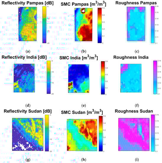 Close-up study over Argentinian Pampas (a–c), India (d–f), and Sudan (g–i). CyGNSS reflectivity (a,d,g), soil moisture content (SMC) (b,e,h), and surface roughness parameter (c,f,i) are displayed here.