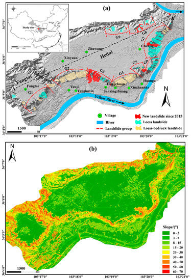 (a) Research region and the distribution of landslides (revised after [11,51]). The overall distribution of landslides can be divided into nine landslide groups, i.e., G1 (Fangtai landslide group), G2 (Xinyuan landslide group), G3 (Dangchuan landslide group), G4 (Huangci landslide group), G5 (Yehugou landslide group), G6 (Jiaojiaya landslide group), G7 (Jiaojia landslide group), G8 (Chenjia landslide group) and G9 (Moshigou landslide group). The inset indicates the location of the study area in China. (b) Slope map of the study area generated from a three-meter spatial resolution digital elevation model (DEM) (hereinafter UAV DEM) generated by unmanned aerial vehicle (UAV) photogrammetry with an optical camera with the type of Sony ILCE-7R_FE35mmF2.8ZA_35.0_7360x 4912 (RGB).