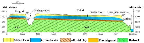 The Heifangtai loess terrace is located in Yongjing county, Gansu province, northwestern China (Figure 1a), and consists of Heitai and Fangtai separated by Hulang gully, occupying a surface area of about 13.7 km2 [9,11,48,49]. The Yellow River and the Huangshui River surround this terrace. The elevation difference from the bottom to the top of the terrace is about 199.1 m, and the slope gradient at the edge of the terrace varies from 20 to 70° (Figure 1b). Based on borehole drilling and geophysical exploration data, the terrace has been determined to be mainly composed of Aeolian loess [50]. Figure 2 shows the engineering geological profile of the terrace along the line A–A’ in Figure 1a in the azimuth of 60° direction, which can be divided into four layers from up to the bottom of Malan loess (), alluvial clay (), fluvial gravel () and bedrock () [11,50]. The top layer is Malan loess with a thickness of 30–50 m, which is mainly composed of silt-sized loess with high porosity and open-paced fabric, resulting in a high susceptibility to collapse upon wetting [11].