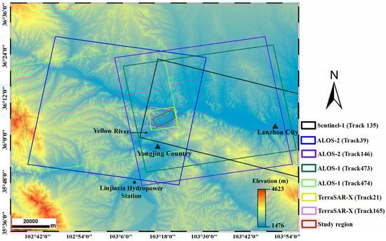 SAR datasets coverage used in the study. The red rectangle indicates the location of the study area, and other different color rectangles indicate different SAR data coverages. The shaded topography is the AW3D30 DSM generated by advanced land observing satellites (ALOS).