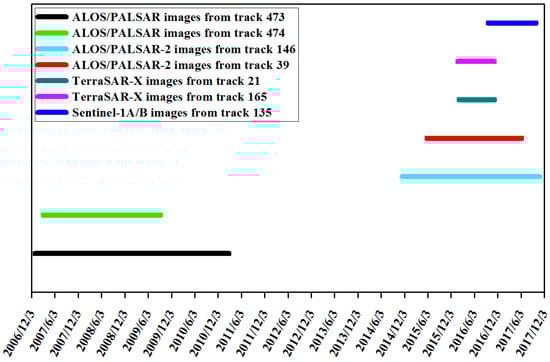 In order to determine the distribution of landslides in the Heifangtai loess terrace and reveal the temporal evolution of landslides over the last 11 years, a total of 111 SAR images from four different satellites and seven different tracks were used in the study (Figure 3). The main parameters of the SAR images used in the study are shown in Table 1. The periods of each dataset are presented in Figure 4. Note that the periods of ascending and descending TerraSAR-X data are less than one year, while those of ALOS/PALSAR and ALOS/PALSAR-2 images are around four and three years, respectively. Unfortunately, no achieved abovementioned SAR images are available during the years of 2011 to 2014.