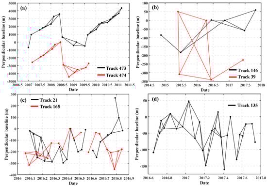 InSAR combinations of the high-quality interferometric pairs and their spatial–temporal baselines for high-quality datasets. (a) Ascending ALOS/PALSAR datasets from tracks 473 (black line) and 474 (red line); (b) Ascending and descending ALOS/PALSAR-2 datasets from tracks 146 (black line) and 39 (red line); (c) Ascending and descending TerraSAR-X datasets from tracks 21 (black line) and 165 (red line); (d) Descending Sentinel-1A/B datasets from track 135.