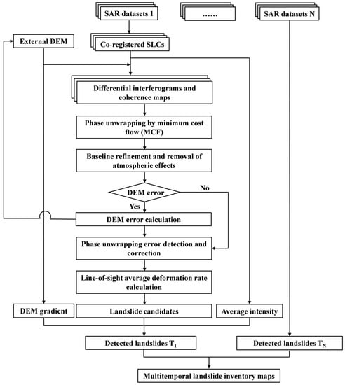 The detailed flowchart of small-scale loess landslide detection based on multi-source and multi-temporal SAR datasets is depicted in Figure 6. For one specific SAR dataset, a suitable master image is first selected considering both the temporal and spatial baseline and the variation of the Doppler central frequency [59], and all slave images are subsequently co-registered to it. Secondly, all possible interferograms are generated by setting appropriate temporal and spatial baseline thresholds, the topographic phase is removed with respect to external DEM, interferograms are filtered [60] and unwrapped with the minimum cost flow (MCF) method [61], the component of stratified atmosphere is removed by estimating a phase delay elevation profile for each interferogram and the residual orbital ramp is removed using refined baselines. Lastly, the average deformation rate for each pixel is calculated by weighted averaging (stacking) of the high-quality interferograms [62]. It should be noted that three key steps—the selection of high-quality interferograms, DEM error correction and phase unwrapping error detection and correction—must be carefully considered in order to detect small-scale loess landslide.