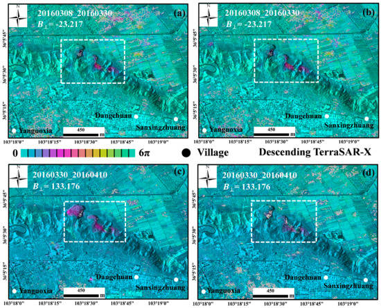 The UAV DEM was acquired over the study region in 2015. Some landslides occurred in the following years, which caused topography change. Hence, DEM errors occur in differential interferograms generated from ALOS/PALSAR-2, TerraSAR-X and Sentinel-1A/B datasets. As an example, two typical interferograms with short perpendicular baseline and long perpendicular baseline are shown in Figure 7a,c. Figure 7a shows the original interferogram with a temporal baseline of 22 days and a perpendicular baseline of −23.217 m. Figure 7c shows the original interferogram with a temporal baseline of 11 days and a perpendicular baseline of 133.176 m. It is clear that the region indicated by the white dotted rectangle in Figure 7c is affected by DEM errors. It is worth noting that the region indicated by the white dotted rectangle in Figure 7a is dominated by unwrapping errors rather than DEM errors, which will be discussed in the next section. DEM errors are estimated with high-quality interferograms and removed from all interferograms. The results of the DEM error correction are given in Figure 7d. It can be seen that the DEM error is well corrected while the deformation signal is well retained.