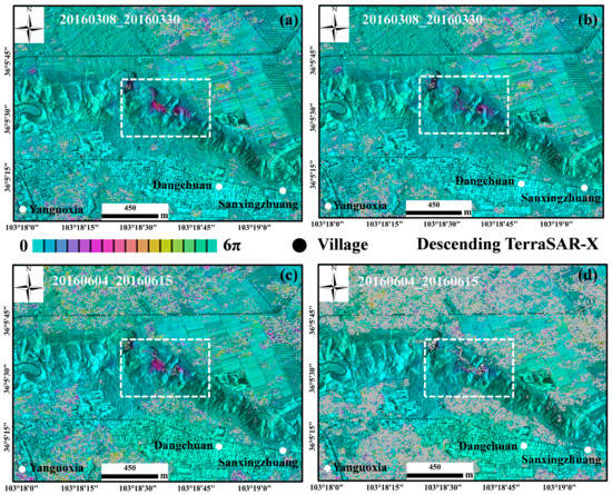 Serious unwrapping errors occur in this region for two main reasons. The first is the losses of coherence caused by dense vegetation coverage, rainfall and agricultural irrigation. The second is the dense fringes presented in the interferograms caused by DEM errors and large deformation gradient. After the correction of the DEM errors, the interferometric fringes caused by DEM errors were successfully removed and the number of fringes was significantly reduced, which makes the phase unwrapping much easier. The remaining unwrapping errors caused by low coherence and large deformation gradient were then corrected by two different methods mentioned above. The unwrapped interferograms before and after phase unwrapping error correction are shown in Figure 8. In Figure 8a,c, it is evident that the deformation signals of the region indicated by the white dotted rectangle are obscured by unwrapping errors. The unwrapping errors in Figure 8a are corrected by the method of adding 2π integer times phase offset. However, for the unwrapping errors in Figure 8c, after several tests, an optimal coherence threshold is set to obtain the corrected unwrapping phase. The corrected results are given in Figure 8b,d, where it can be seen that the phase unwrapping errors are well corrected and the deformation signals are retained.