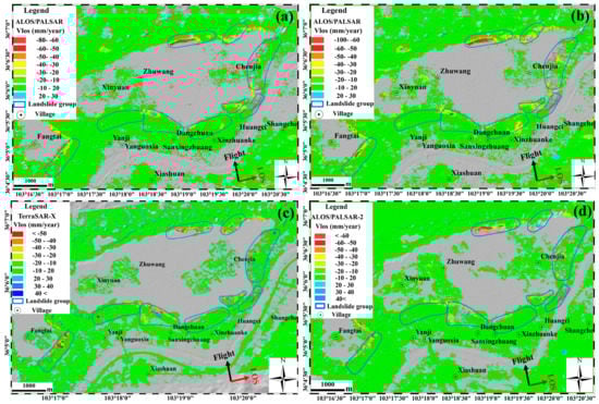Average line-of-sight deformation rate maps for the Heifangtai loess terrace calculated with ascending SAR datasets. The blue polygons indicate the distribution of landslide groups. (a) ALOS/PALSAR data with track 473 acquired from December 2006 to March 2011; (b) ALOS/PALSAR datasets with track 474 acquired from March 2007 to October 2009; (c) TerraSAR-X datasets with track 21 acquired from February 2016 to November 2016; (d) ALOS/PALSAR-2 datasets with track 146 acquired from November 2014 to November 2017.