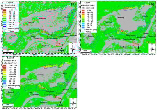 Average line-of-sight deformation rate maps for the Heifangtai loess terrace calculated with descending SAR datasets. (a) TerraSAR-X datasets with track 165 acquired from January 2016 to November 2016; (b) ALOS/PALSAR-2 datasets with track 39 acquired from May 2015 to July 2017; (c) Sentinel-1A/B datasets with track 135 acquired from September 2016 to October 2017.