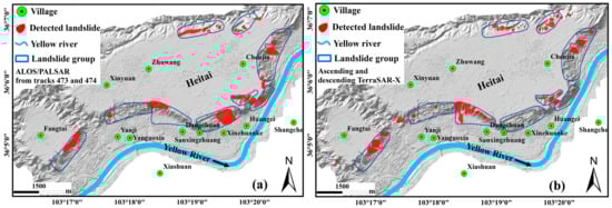 A total of 32 potential landslide areas are identified from December 2006 to March 2011 (the first stage), and a total of 48 active landslides are identified from January 2016 to November 2016 (the second stage), which are shown in Figure 11. Note that the deformation rate calculated with L-band ALOS/PALSAR data is merged together and the single small landslides cannot be distinguished due to their low spatial resolution with respect to X-band TerraSAR-X data. Therefore, the potential landslide areas in Figure 11a may contain several small active landslides. It can be seen that the Fangtai landslide group contains one large landslide area for the first stage and three small landslides for the second stage; the Xinyuan landslide group contains one landslide for the first stage and three small landslides for the second stage; the Dangchuan landslide group contains one large landslide area for the first stage and eleven small landslides for the second stage; the Huangci landslide group contains one landslide for the first stage, and no detectable active landslides for the second stage; the Yehugou landslide group contains four landslides for the first stage and six landslides for the second stage; the Jiaojiaya landslide group contains two landslides for the first stage and one landslide for the second stage; the Jiaojia landslide group contains five landslides for the first stage and three landslides for the second stage; the Chenjia landslide group contains ten landslides for the first stage and nine landslides for the second stage; and the Moshigou landslide group contains six landslides for the first stage and nine landslides for the second stage. The distribution of landslides identified by the InSAR technique is in good agreement with that identified by field geological survey [11].