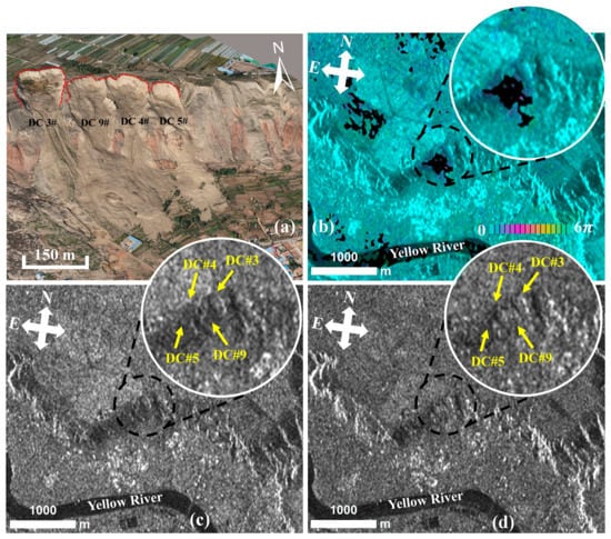 (a) A scene photo after the occurrence of the Dangchuan No. 4 (DC#4), Dangchuan No. 5 (DC#5) and Dangchuan No. 9 (DC#9) landslides; (b) The unwrapped interferogram generated from Sentinel-1A/B data acquired on 28 September 2017 and 10 October 2017 in SAR coordinate; (c) The intensity image of Sentinel-1A/B data in SAR coordinate acquired on 28 September 2017 before the landslide occurred; (d) The intensity image of Sentinel-1A/B data in SAR coordinate acquired on 10 October 2017 after the landslide occurred.