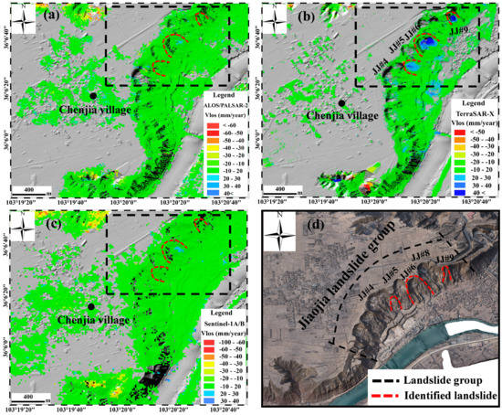 Average line-of-sight deformation rate maps for the Jiaojia landslide group. (a) Descending ALOS/PALSAR-2 datasets acquired from May 2015 to July 2017; (b) Descending TerraSAR-X datasets acquired from January 2016 to November 2016; (c) Descending Sentinel-1A/B datasets acquired from September 2016 to October 2017; (d) UAV photograph. The black dotted line indicates the range of the Jiaojia landslide group, and the red dotted line indicates the identified landslides.