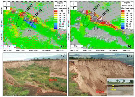 The Dangchuan landslide group. (a) Average line-of-sight deformation rate map calculated with ascending TerraSAR-X data from February 2016 to November 2016; (b) Average line-of-sight deformation rate map calculated with descending TerraSAR-X data from January 2016 to November 2016; (c) A scene photo of the Dangchuan No.3 landslide (DC#3). The red dotted line represents the boundary of the landslide; (d) A scene photo of the Dangchuan No.4 landslide (DC#4). The red dotted line represents the boundary of the landslide.
