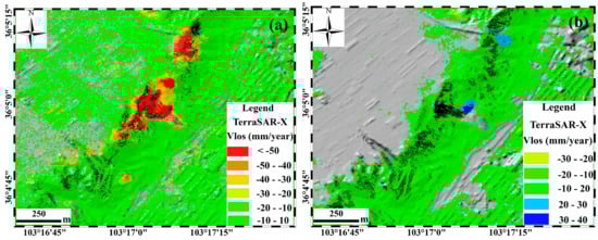 The Fangtai landslide group. (a) Average line-of-sight deformation rate map calculated with ascending TerraSAR-X data from February 2016 to November 2016; (b) Average line-of-sight deformation rate map calculated with descending TerraSAR-X data from January 2016 to November 2016.
