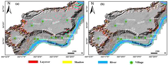 Geometric distortions in the TerraSAR-X ascending (a) and descending (b) images over the Heifangtai loess terrace. The white dotted line indicates the location of the Fangtai landslide group (G1) and the Dangchuan landslide group (G3).