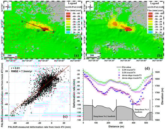 The line-of-sight deformation rate maps for the Dangchuan landslide group between 2007 and 2009 are calculated using ALOS/PALSAR datasets from the adjacent tracks 473 and 474, as shown in Figure 20a,b, respectively, where it can also be seen that a good agreement in the spatial distribution of the active deformation areas can be obtained from both adjacent track datasets. The maximum deformation rates calculated using track 473 and track 474 are −90 mm/year and −100 mm/year, respectively. Scatter plots of the deformation rates obtained from tracks 473 and 474 are shown in Figure 20c. The root mean square error (RMSE) of the difference and the correlation coefficient are 7.3 mm/year and 0.81, respectively, which shows a good consistency of deformation rates. However, it can be observed in Figure 20c that a systematic offset still exists between the two results. In order to explain this difference, the differences in the flight direction and local incidence angle between the two adjacent satellite track data are considered. The flight directions of the ALOS/PALSAR satellite in tracks 473 and 474 are −10.3° and 9.9°, respectively, and the local incidence angles of tracks 473 and 474 at the Dangchuan landslide group are 37.2° and 39.8°, respectively. The deformation rates in the line-of-sight direction and in the downslope direction along line BB’ are shown in Figure 20d, where it can be seen that two large deformed funnels correspond to the Dangchuan No.2 and Dangchuan No.3 landslides, which occurred in April 2015 and August 2015, respectively. Furthermore, the discrepancy between the two profiles in the downslope direction is much less than that in the line-of-sight direction, which indicates the high-accuracy of InSAR measurements.