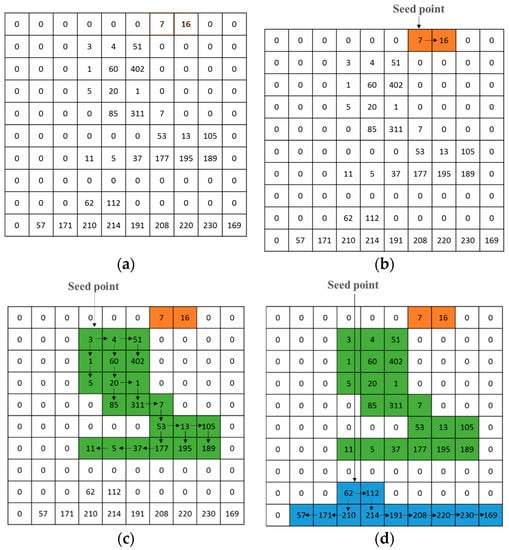 Then, the table was divided into different parts by using a two-dimensional region growing algorithm (Algorithm 2, Figure 8). In Algorithm 2, Pseed is a set that reserves seed cells.