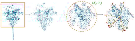(2) For trees whose trunk points at breast height are sparse and cannot depict the profile of the trunk, all trunk points are employed to measure DBH. Trunk points are segmented vertically with a proper spacing, 0.2 m to 0.4 m. Points in each segment would be projected onto the horizontal plane and a fitted circle would be formed for the points in the segment. The average of diameters of all circles is DBH (Equation (10)).