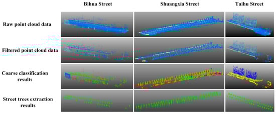 Before conducting coarse classification, the square grid size and the layer spacing needed to be determined. In order to find appropriate grid size, layer spacing, and the number of classes, we attempted different combinations of these three parameters. Final combinations for the three streets were shown in Table 4. Bihua Street and Shuangxia Street had the same grid size and layer spacing, while these two parameters of Taihu Street were slightly larger. The final grid sizes, 4 m × 4 m and 5 m × 5 m, were close to the sizes of street trees’ crowns. By observing ground objects on the three streets, we found that there was no building on Shuangxia Street, and buildings on Taihu Street were higher than buildings on Bihua Street. In addition, Taihu Street had more abundant variety of ground objects than other two streets. Therefore, Taihu Street needed a lager layer spacing (2 m), and more classes (4 classes). With the final parameters setting, most street trees were classified into the same class. Then, points in the class, which contained street trees, were allocated to different point clusters. When a point cluster met all requirements presented in Table 2, the point cluster would be extracted as a street tree.