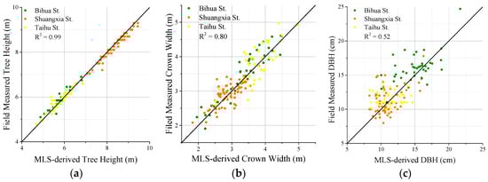 To understand the relevance between MLS-derived parameters and field measured parameters, scatter plots were created for the three parameters (Figure 13). R2 values for tree height and crown width are 0.99 and 0.80, respectively, while R2 for DBH is 0.52. Due to the issue of tree trunks point density, measurements of DBH is more difficult and complicated, and MLS-derived DBH is less correlated with field measured DBH. Tree heights of street trees ranging from 4 m to 10 m, and this parameter showed a better agreement between MLS-derived results and field measured results than the other two parameters. Trees on Shuangxia Street had larger tree heights than trees on Bihua Street and Taihu Street. Crown widths were between 1.5 m and 5 m, and street trees on Taihu Street had larger average crown width. As for DBH, most street trees had DBH ranging from 7.5 cm to 20 cm, only a tree on Bihua Street had DBH approximated to 25 cm. Overall, morphological parameters derived from MLS data had relatively high accuracy.