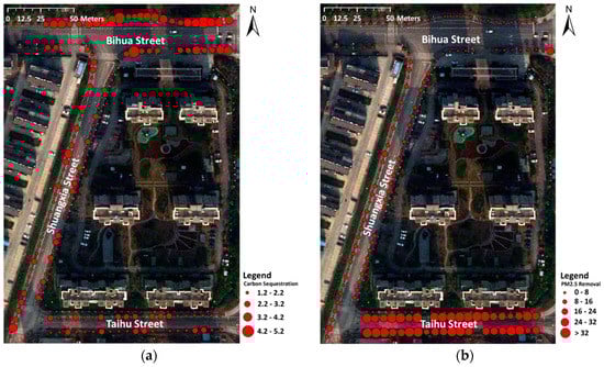 Annual carbon sequestration and PM2.5 removal of each street tree. (a) Annual carbon sequestration of street trees; (b) PM2.5 removed by street trees in April 2015.