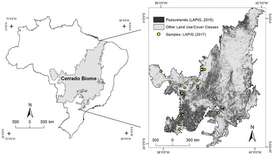 Location of the Cerrado study area, highlighting the regions of cultivated pastures based on 2016 estimates [30]. The points represent the field samples used in this study.