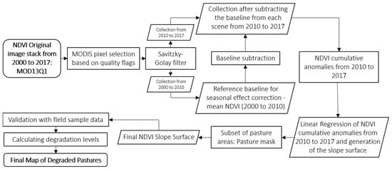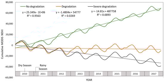 Residual atmospheric noise and data outliers in the time series vectors were smoothed with the Savitzky-Golay filter [35], considering a 5-point window over 2 fitting steps, adaptation strength of 2, and no spike or amplitude cutoffs. The measurement of degradation was based on the analysis of the NDVI trend along time, considering positive trends as improvement and negative trends as degradation, within the analyzed period [8,38,39]. We computed a series of cumulative NDVI anomaly images seasonally corrected according to a 2000–2010 baseline (Figure 2). Thus, we eliminated the seasonal noise in the NDVI time series by subtracting the respective average NDVI image (2000 to 2010) from the NDVI of each image of the image stacks in the period of interest (2010 to 2017), as described in (1):