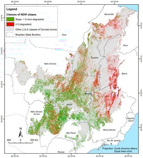 The Methods section presents an overview of the steps adopted in this study to map degraded pastures in the Cerrado biome (Figure 2). The first step comprised the analysis of the slope of NDVI time-series using negative values as a proxy for pasture degradation. In this step, we considered a method based on the estimation of regression slopes of cumulative NDVI anomalies (i.e., adjusted to remove the seasonal noise). The method based on cumulative anomalies was considered due to the high uncertainty and statistical instability of models based on the regression of original NDVI time-series [25]. As a second step, the resulting slope surface was then segmented into non-degraded and degraded pastures for subsequent correlation with ancillary variables.