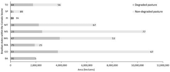Absolute and relative (%) areas of degraded and non-degraded pastures in the Cerrado biome within the Brazilian states. Light gray and dark gray columns represent non-degraded and degraded pastures, respectively, and the values in the columns show the relative area (%) of each pasture category.
